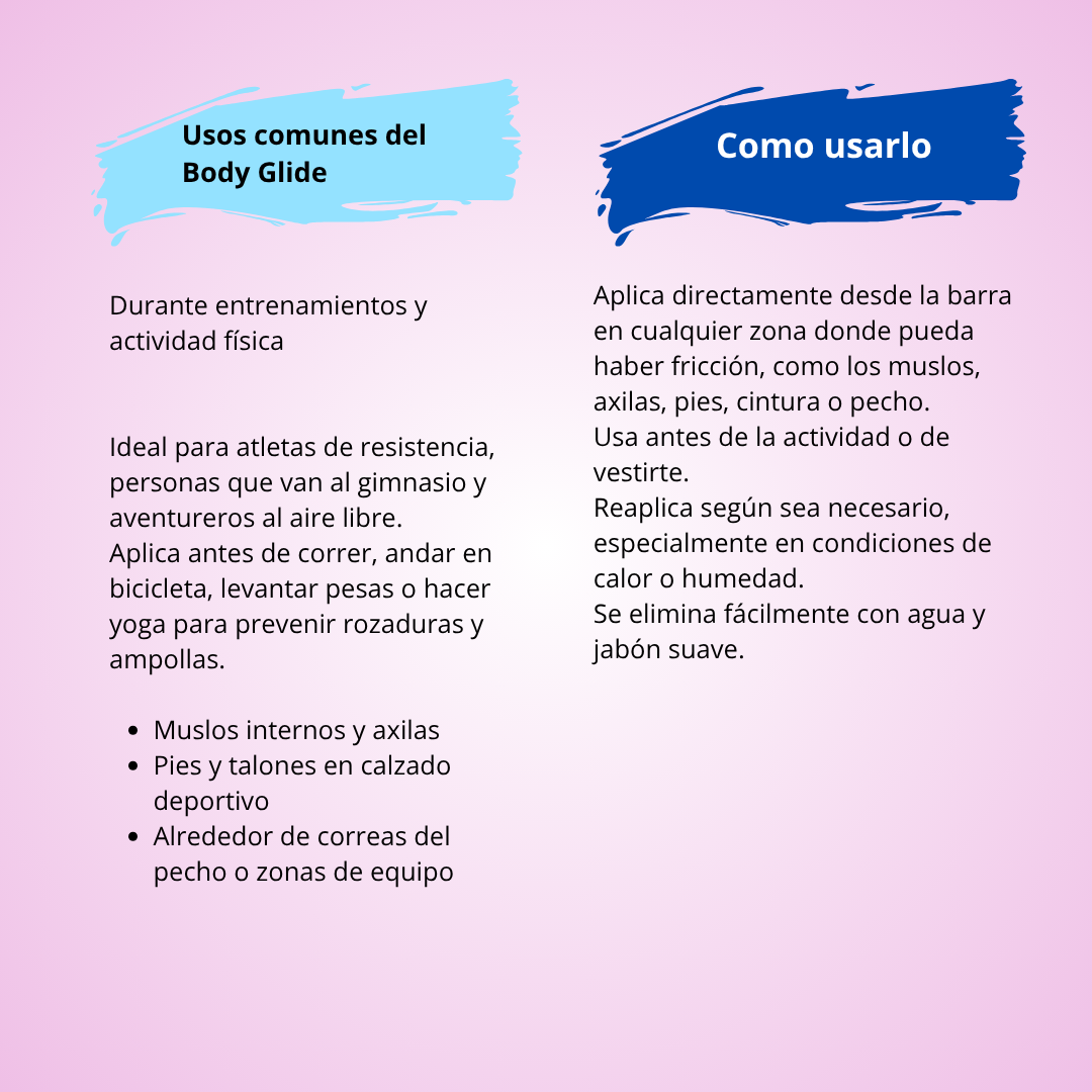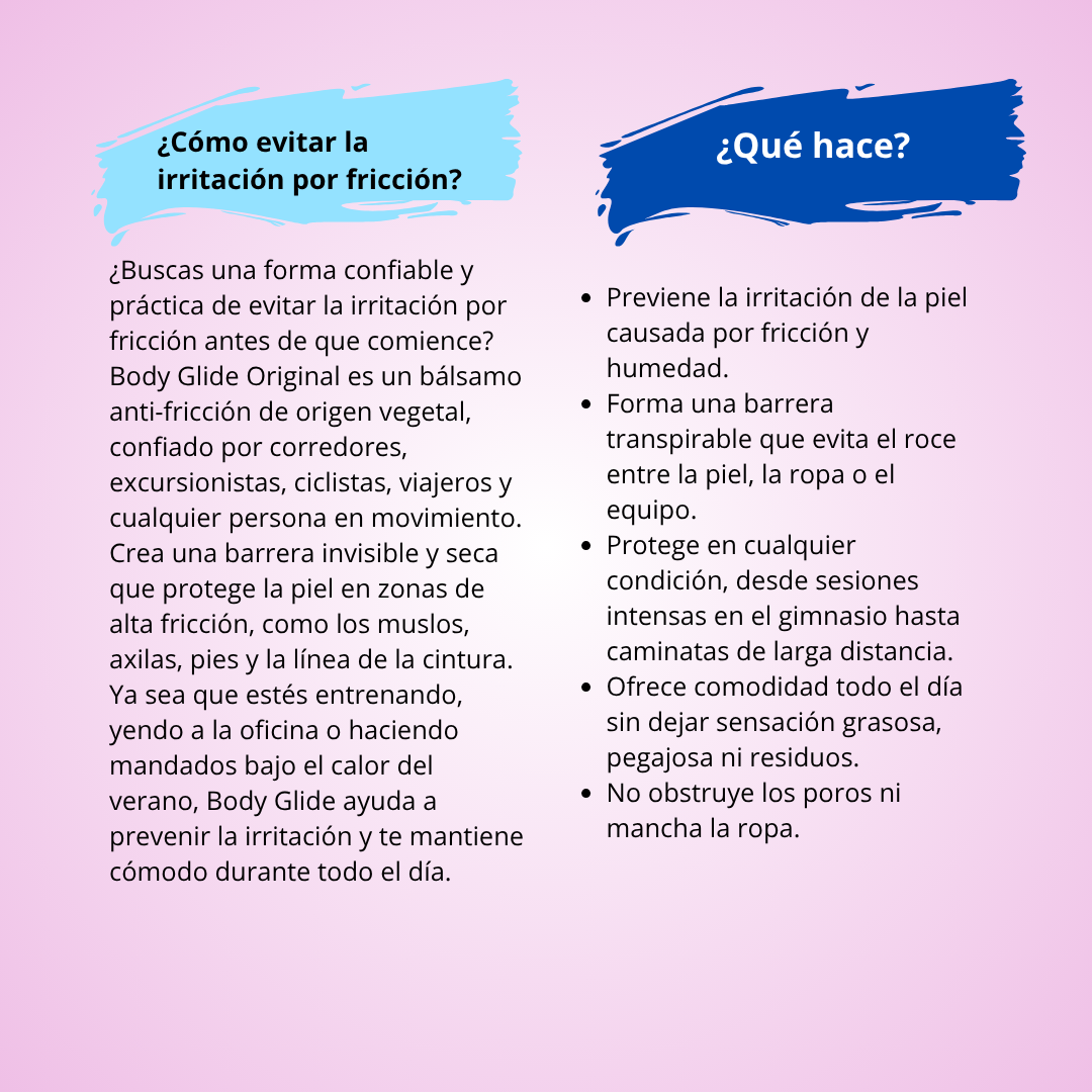 ¿Buscas una forma confiable y práctica de evitar la irritación por fricción antes de que comience? Body Glide Original es un bálsamo anti-fricción de origen vegetal, confiado por corredores, excursionistas, ciclistas, viajeros y cualquier persona en movimiento. Crea una barrera invisible y seca que protege la piel en zonas de alta fricción, como los muslos, axilas, pies y la línea de la cintura. Ya sea que estés entrenando, yendo a la oficina o haciendo mandados bajo el calor del verano, Body Glide ayuda a prevenir la irritación y te mantiene cómodo durante todo el día.